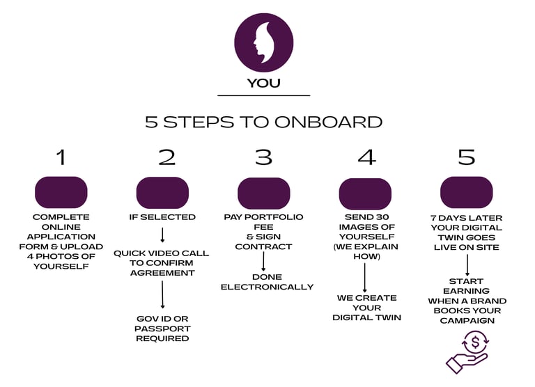 Attractive women & men 50+ who look healthy, have good skin texture without major scars or tattoos, who photograph well and want passive income. Your digital twin is an exact replica of you.